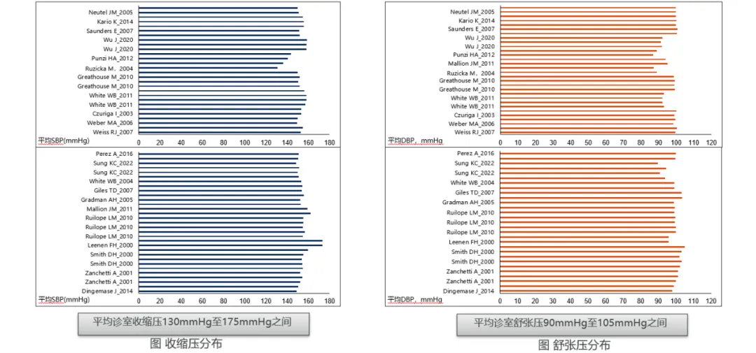 該研究是一項系統(tǒng)性文獻綜述和網(wǎng)狀薈萃分析,涵蓋了2000年1月至2023年12月間發(fā)表的文獻,對比了美阿沙坦鉀(azilsartan medoxomil,簡稱AZL-M)與其他常用一線降壓藥物(ARB、ACEI、ARNI、β-受體阻滯劑、鈣通道阻滯劑)在輕至中度高血壓患者中的降壓療效。評估篩選標準包括輕至中度高血壓患者、隨機對照試驗(RCT)等,最終納入21項RCT研究,其中大多數(shù)研究將安慰劑作為對照,部分研究(9 項)將降壓藥同時作為干預和對照,研究報告的基線平均診室血壓如下: