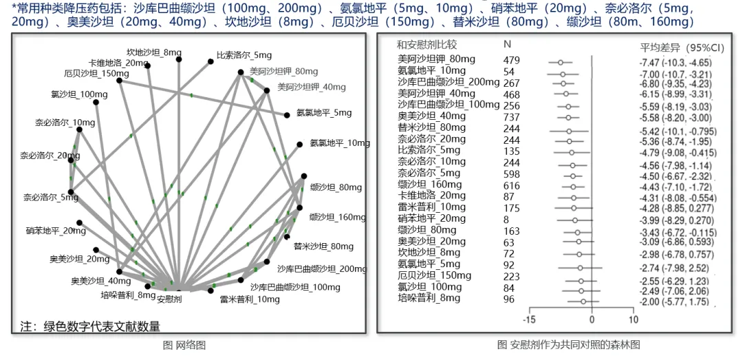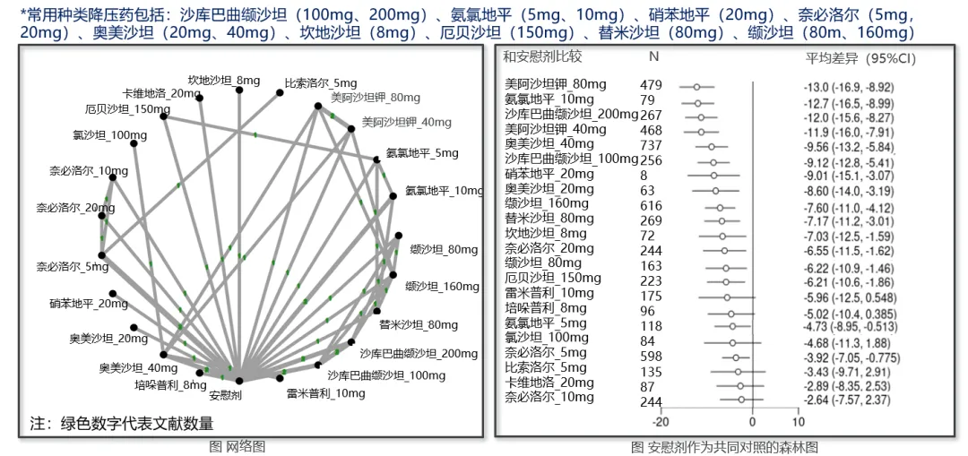 網(wǎng)狀薈萃分析結果顯示:與安慰劑對照,在常用降壓藥(ARB、ACEI、ARNI、β-受體阻滯劑、鈣通道阻滯劑)中,美阿沙坦鉀80mg的診室收縮壓和舒張壓降幅均最大;
